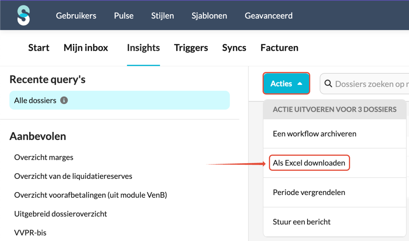 Alle gebruikers kunnen queryresultaten voor geselecteerde dossiers downloaden als Excel-bestand.