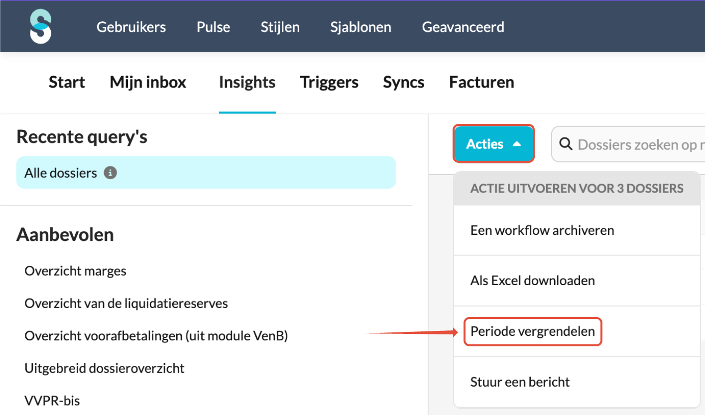 Admin-gebruiker kunnen periodes voor meerdere klantdossiers tegelijk vergrendelen via het Acties-menu.