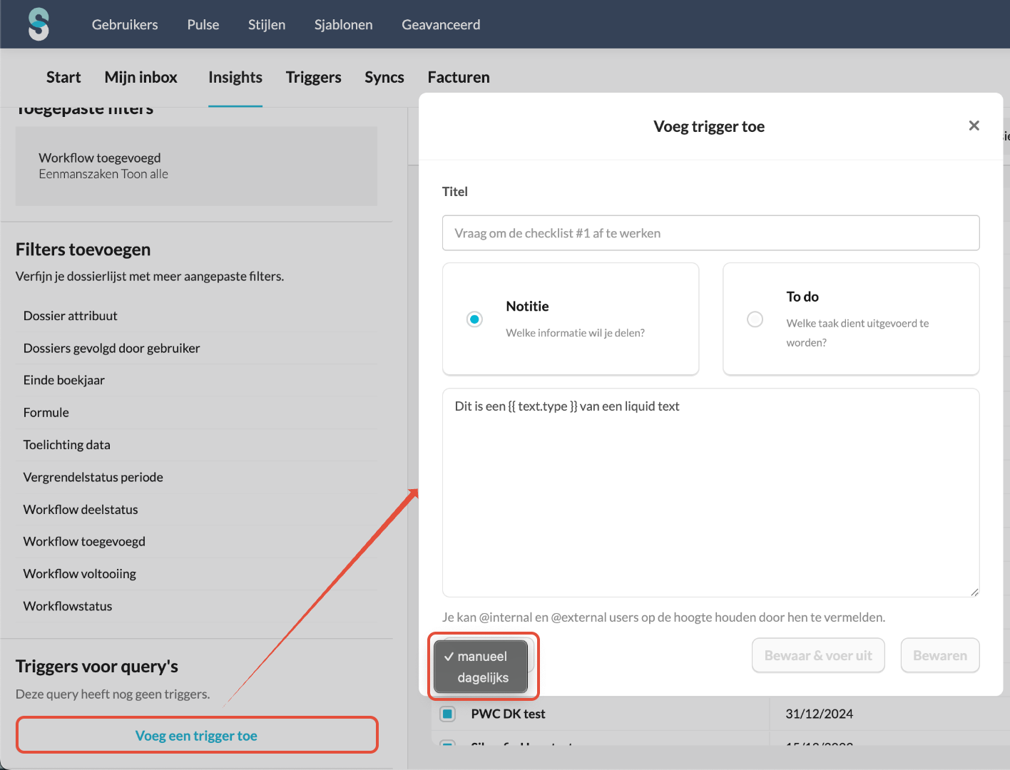 - Dagelijks: Silverfin voert de trigger dagelijks uit en maakt automatisch Notities of To-do’s aan zodra nieuwe dossiers aan de voorwaarden voldoen.