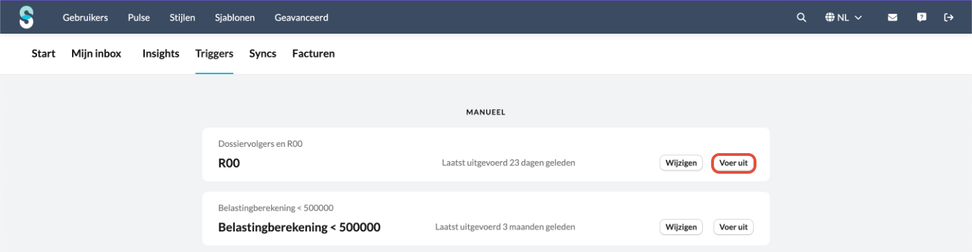 - Je kunt een trigger op elk moment handmatig uitvoeren via het Triggers-overzicht door voer uit te selecteren.