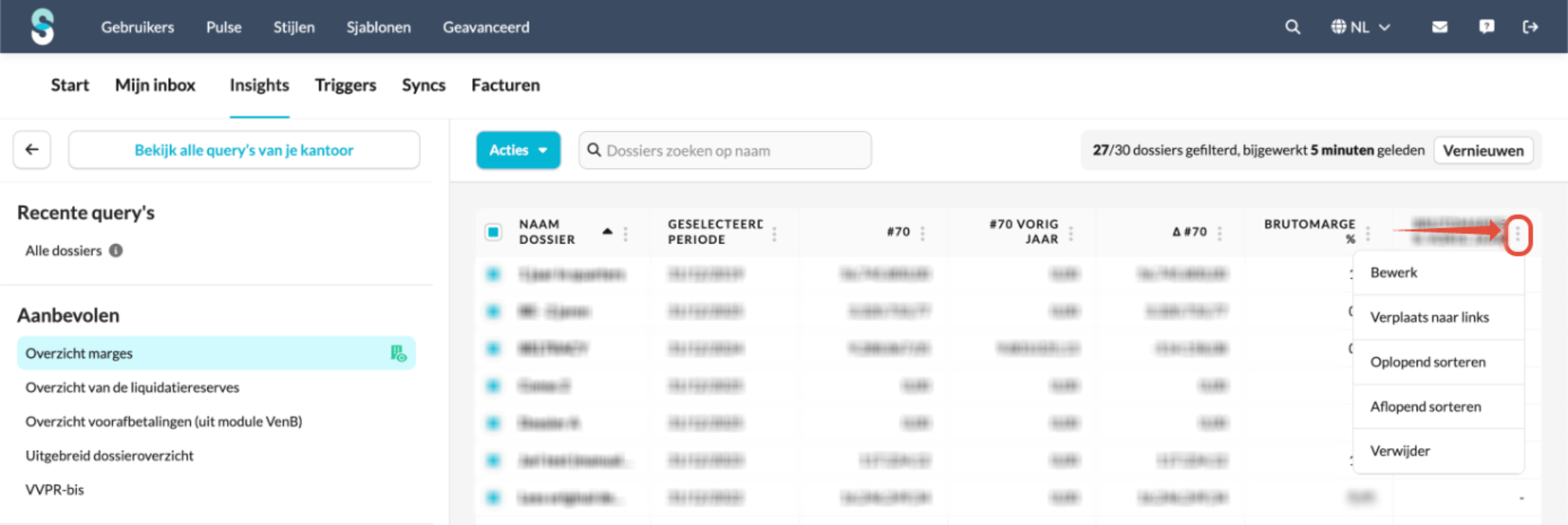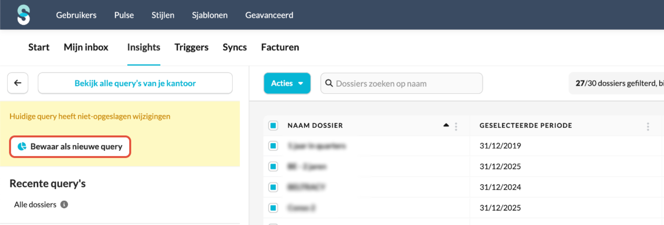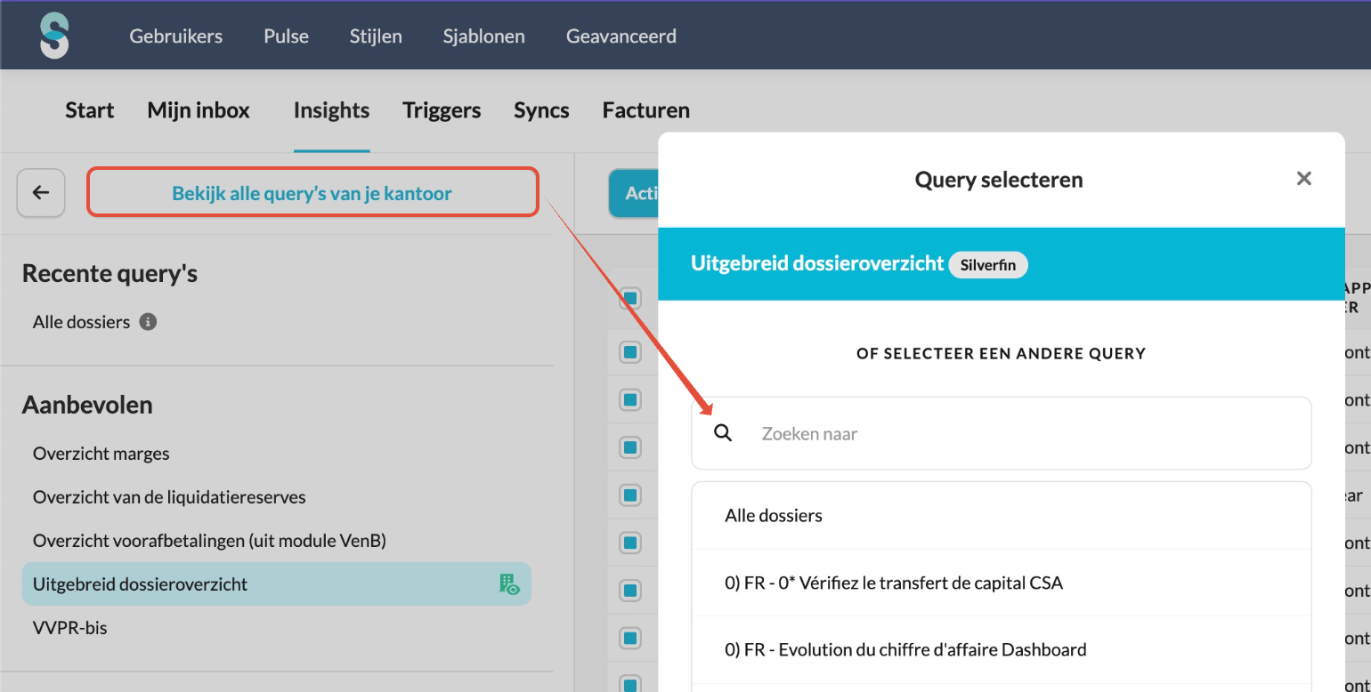 Dit artikel legt uit hoe je Insights gebruikt, een extra Silverfin-module die je een volledig overzicht geeft van gegevens over al je klantdossiers heen. Je leert hoe je query's aanmaakt en beheert en hoe je acties automatiseert met behulp van triggers.