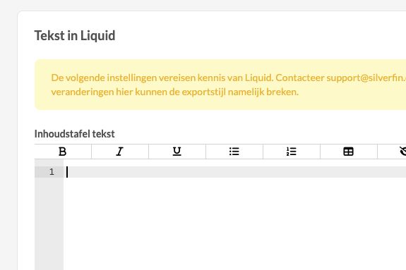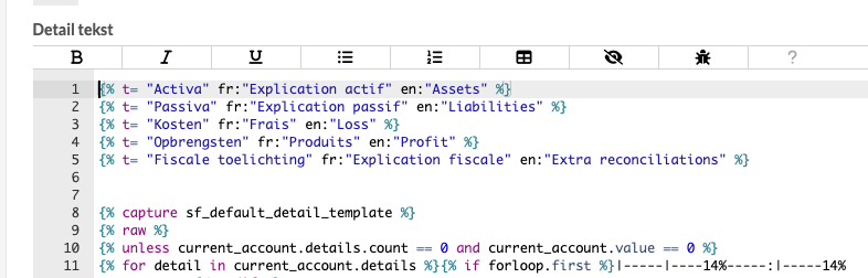 Bij het aanmaken van de stijl moet je op een aantal plaatsen liquid code toevoegen. Deze code bepaalt hoe de jaarrekening wordt opgebouwd en hoe de verschillende onderdelen worden weergegeven in de PDF-export. Wees voorzichtig bij het aanpassen van deze code. Als je geen ervaring hebt met liquid templates, wijzig de code dan niet inhoudelijk.