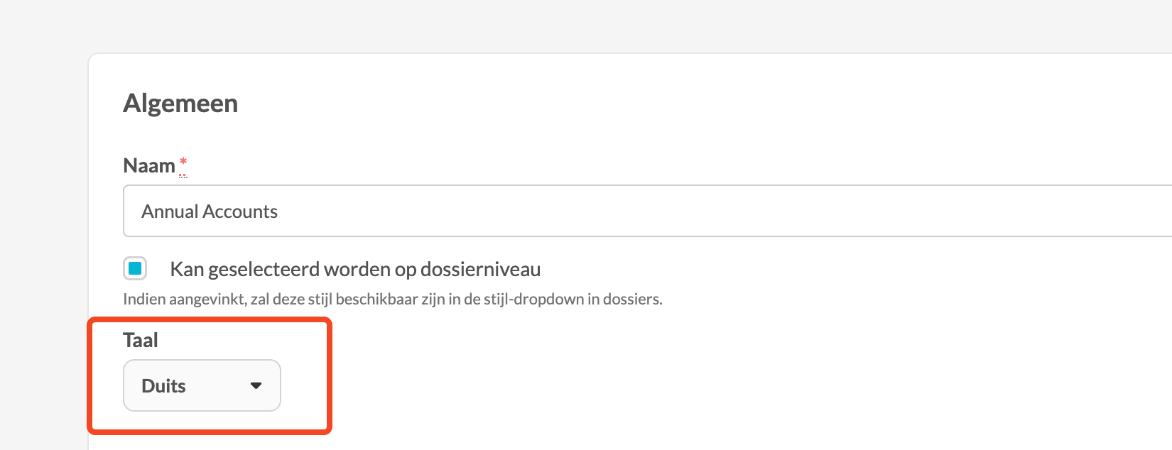 Als Duits niet zichtbaar is in de talenlijst, neem contact op met je customer success manager. Zij kunnen dit activeren via de geavanceerde instellingen van je kantoor.