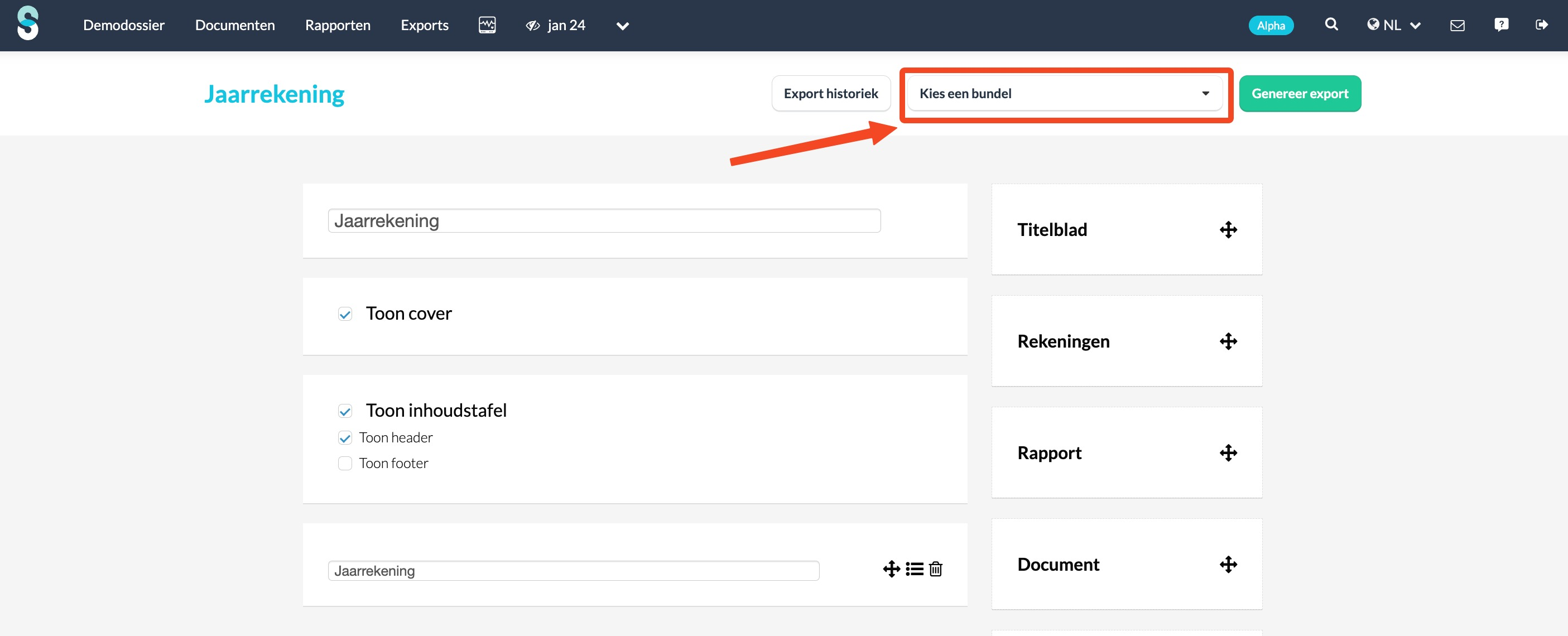 - Kies een vooraf ingestelde exportbundel voor de jaarrekening in de dropdown.
