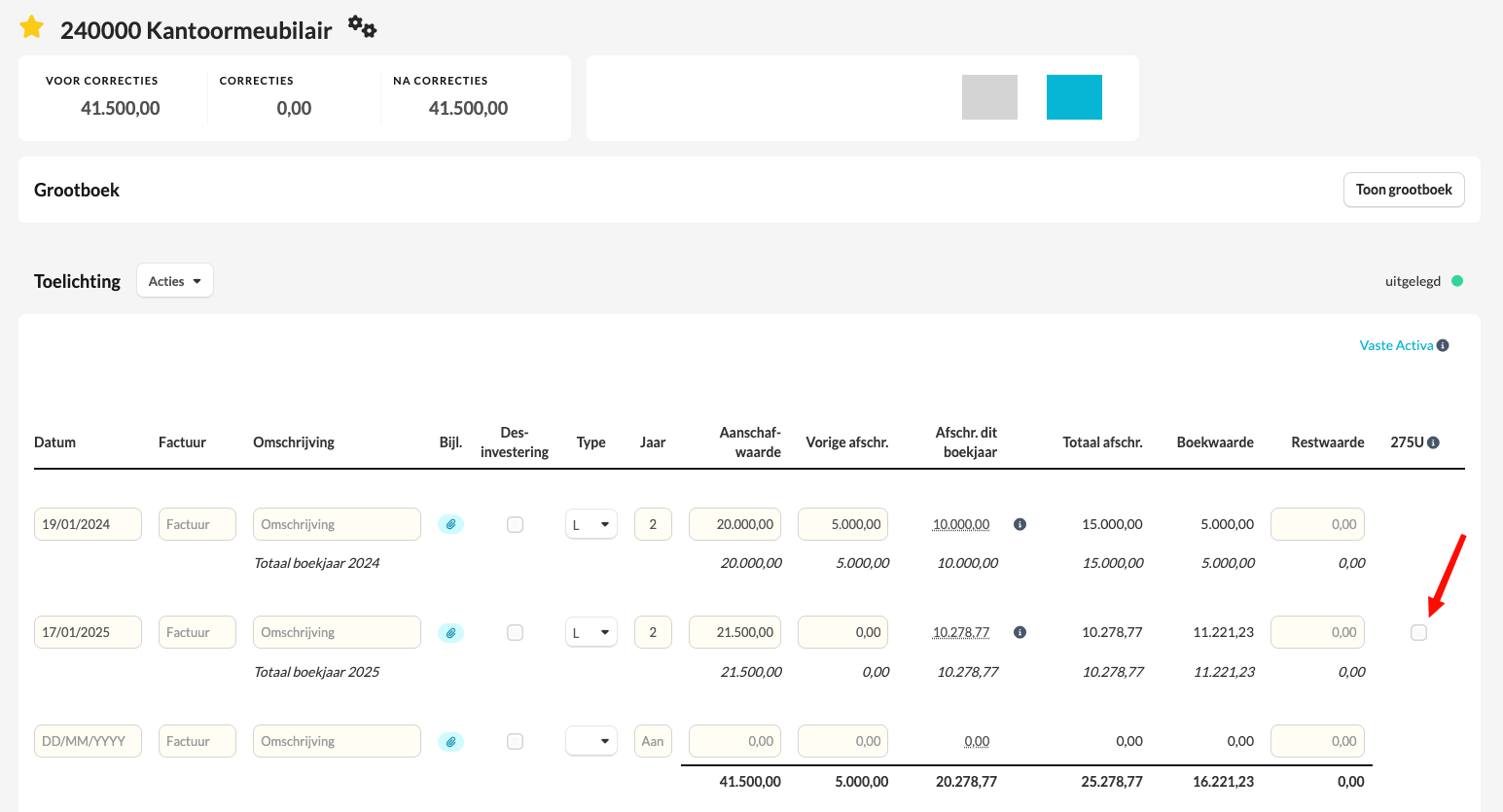 Voor nieuwe investeringen (die met een datum in het huidige boekjaar) wordt er een selectievakje in de kolom '275U' toegevoegd. In deze kolom kun je per investering aangeven of deze moet worden opgenomen in de "275 U - Investeringsaftrek".