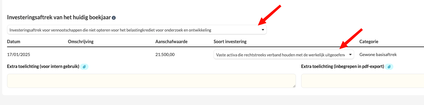 Wanneer je het selectievakje bij een specifieke regel aanvinkt, verschijnen er onderaan het sjabloon "Investerings- en afschrijvingstabel" voor die regel verschillende keuzemenu's. Hiermee kun je het type investeringsaftrek bepalen.