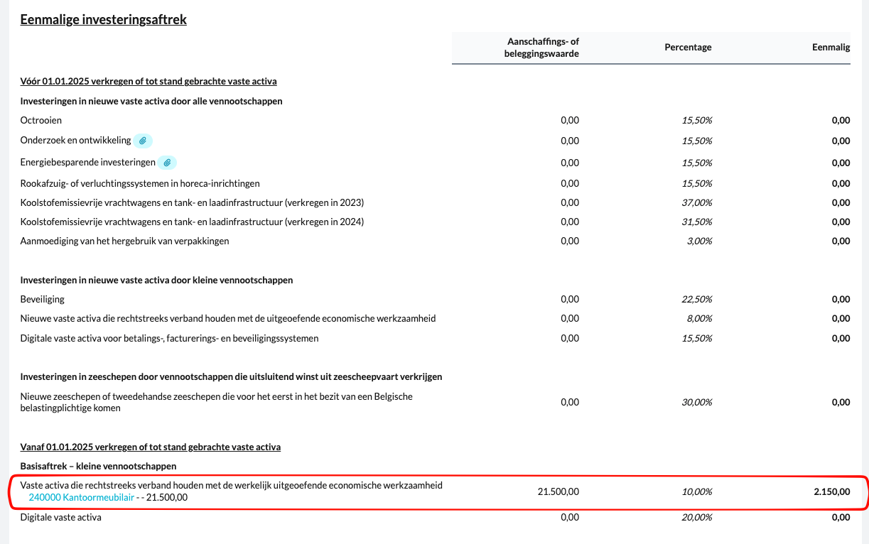 Dit zorgt ervoor dat het juiste bedrag automatisch wordt overgenomen naar de "275 U - Investeringsaftrek."