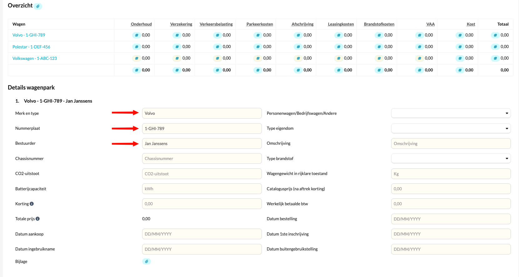 De eerste stap is het invullen van het Wagenpark. Verdere informatie over het Wagenpark vind je in dit artikel. Om gebruik te maken van het rekeningsjabloon moet je zowel nummerplaat, bestuurder als merk en type ingeven in de toelichting ”Wagenpark“.