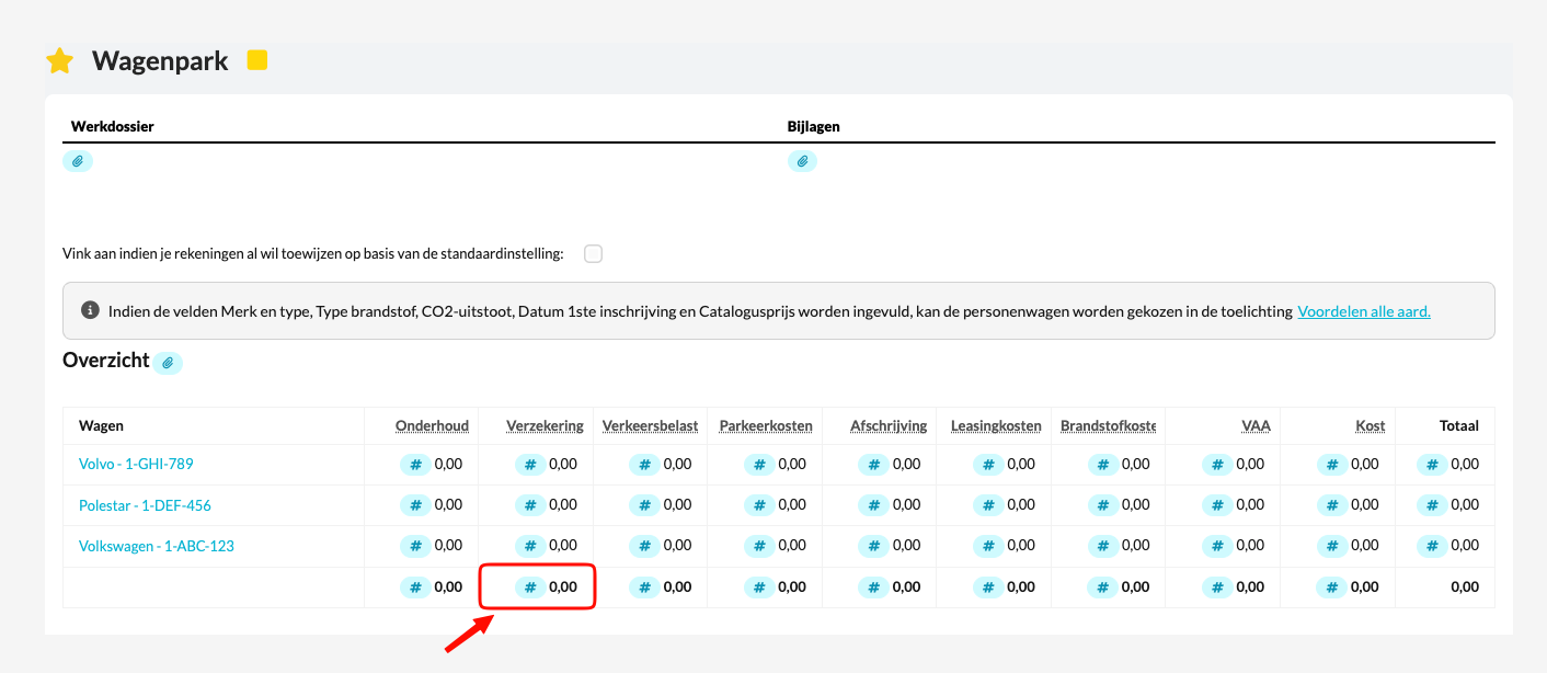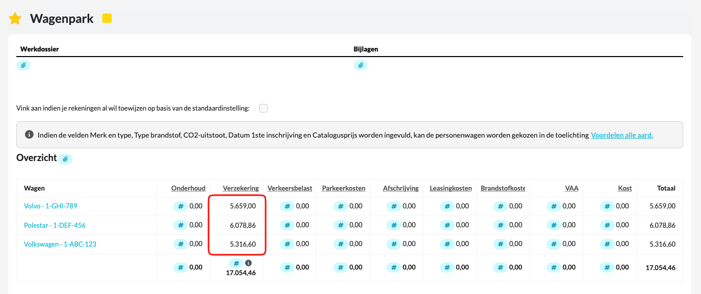 Wanneer je kosten, zoals "verzekeringen", voor verschillende voertuigen op één kostenrekening boekt, selecteer je deze kostenrekening in de tabel in het Wagenpark, in de totaalrij van de betreffende kolom.