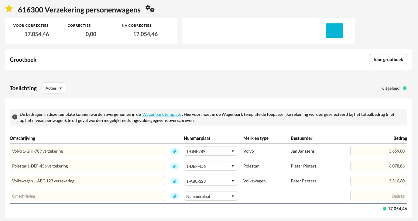 De geselecteerde kosten op de specifieke rekeningen zullen daarna automatisch naar het wagenpark worden teruggekoppeld en per nummerplaat worden uitgesplitst.