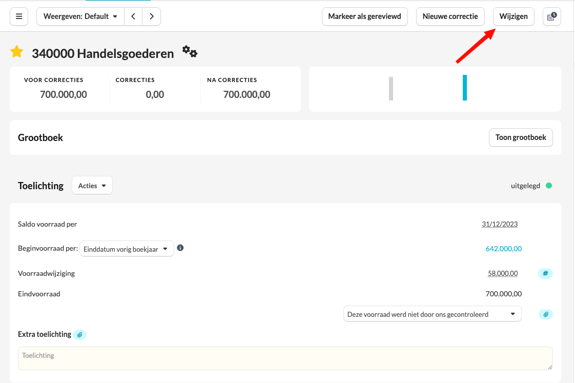 Op dossierniveau kan je het sjabloon toevoegen binnen de rekening in het werkdossier via de knop Wijzigen in de rechterbovenhoek.