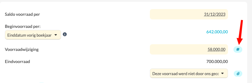 Je kunt de relevante voorraadwijzigingsrekening toevoegen met behulp van de hashtag.