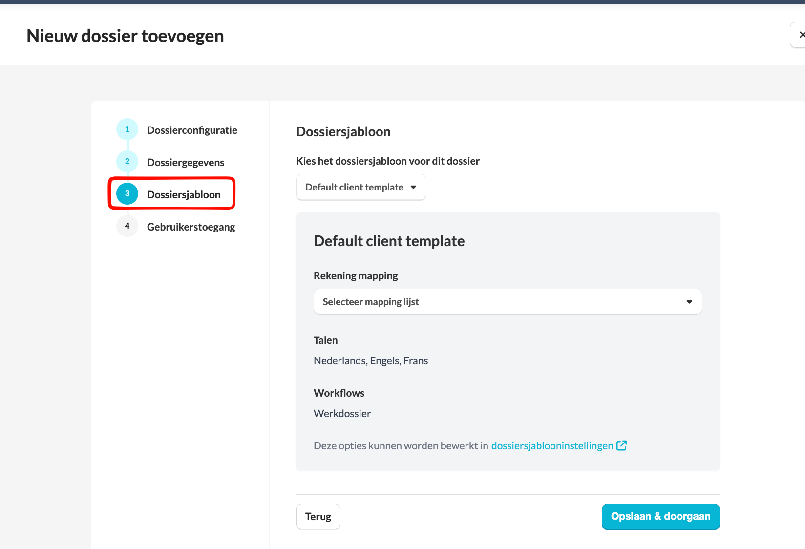 Selecteer het dossiersjabloon voor het dossier. Dit sjabloon, dat op kantoorniveau wordt ingesteld, voegt automatisch een set workflows en rapporten toe aan het dossier om het installatieproces te versnellen.