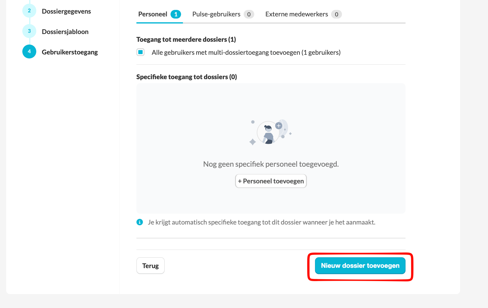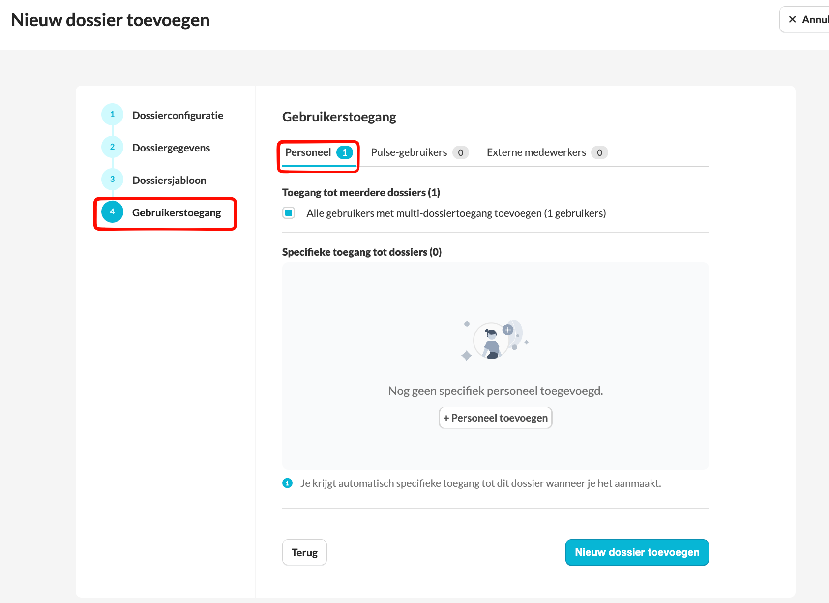 - Personeel: bepaal of specifieke gebruikers of gebruikers met toegang tot meerdere dossiers toegang moeten krijgen. U kunt ook groepen toevoegen.