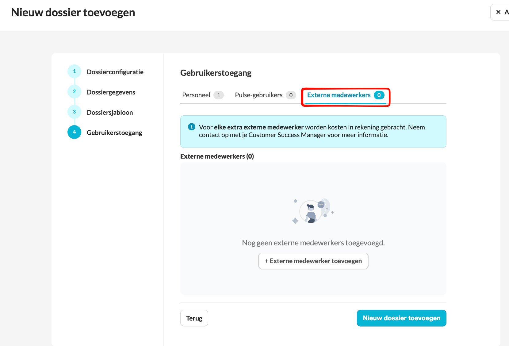 - Externe medewerkers: Voeg externe partijen toe aan het dossier. Voor elke extra externe medewerker worden extra kosten in rekening gebracht. Neem contact op met uw Customer Success Manager voor meer informatie.