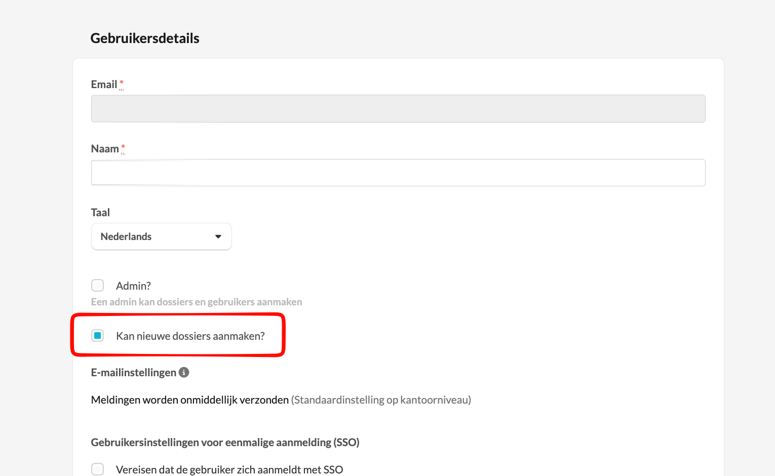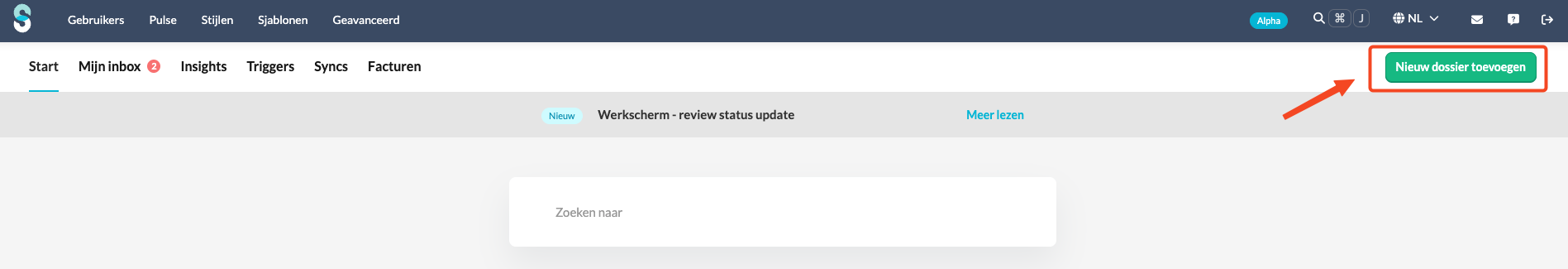 Ziet u de optie "Kan een nieuw dossier aanmaken?" niet staan? Neem dan contact op met uw Customer Success Manager.