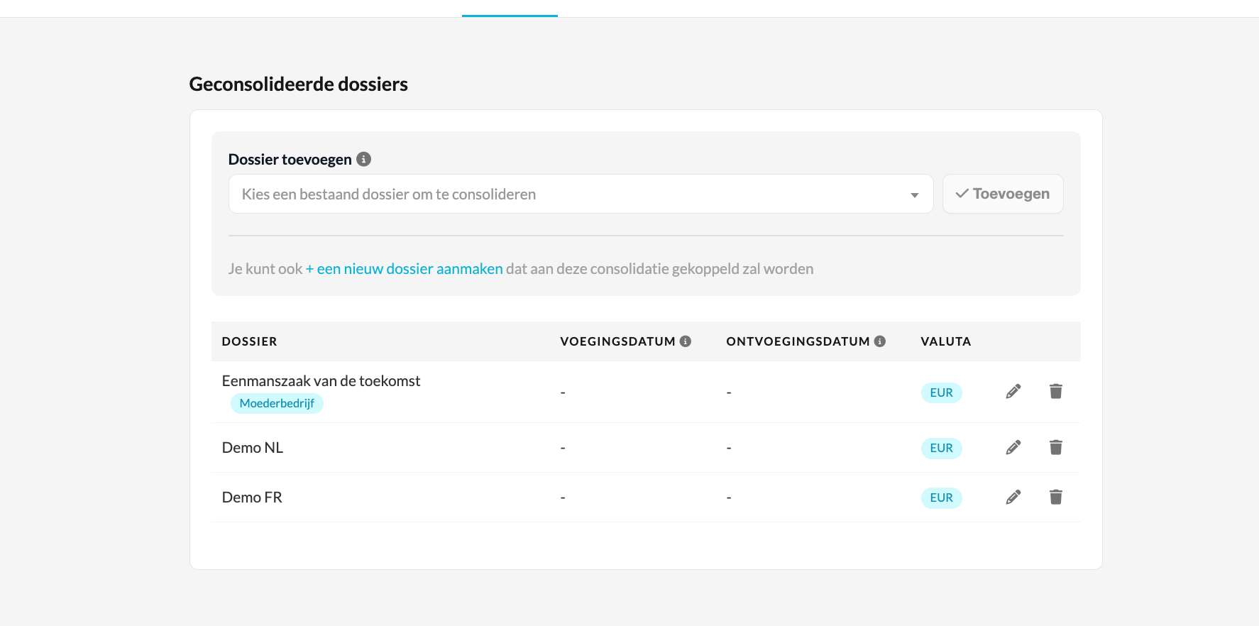 Nadat u het consolidatiedossier heeft ingesteld, verschijnt het Consolidatiescherm. Hier kunt u alle dossiers toevoegen die deel uitmaken van de consolidatie.