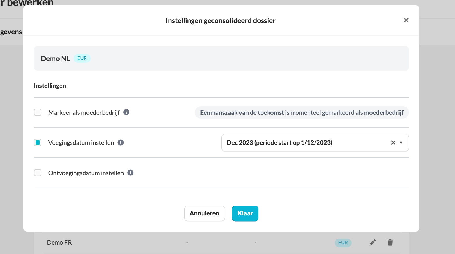 Voegings- of ontvoegingsdatum instellen: U kunt de datum opgeven waarop een dossier toetreedt tot of uit de consolidatie stapt. Zonder datum gebruikt Silverfin alle beschikbare gegevens van dat dossier.