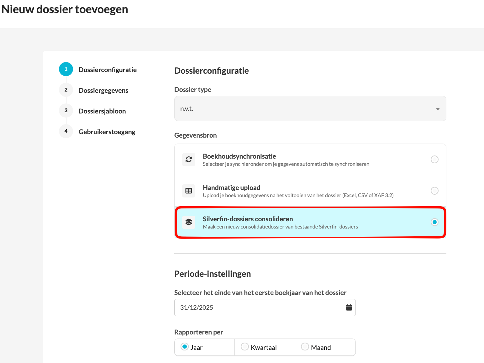- Kies de optie 'Silverfin-dossiers consolideren' in de sectie 'Gegevensbron'.