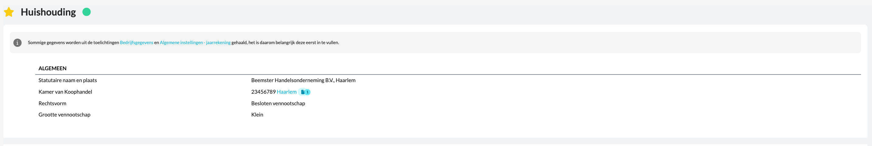 Let op! sommige gegevens in de template worden automatisch opgenomene uit de toelichting, bedrijfsgegevens en de algemene instellingen van de jaarrekening. Vul deze daarom eerst in voordat je de huishouding aanvult, zodat alle informatie correct wordt doorgestroomd.