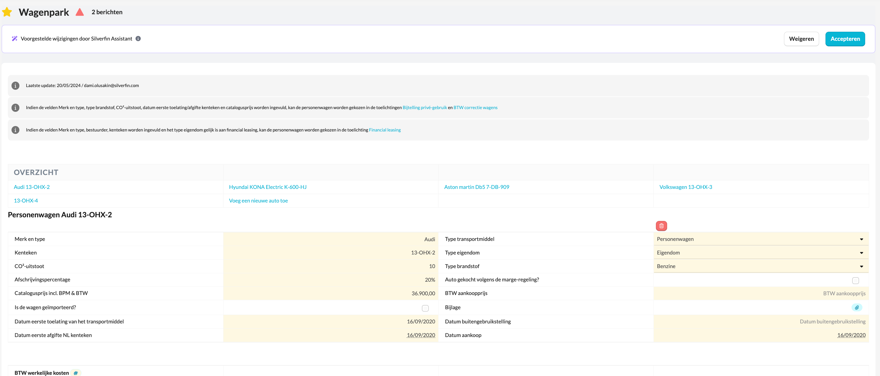 Door deze gegevens correct vast te leggen, worden de fiscale berekeningen (zoals bijtelling en BTW-correctie) automatisch en foutloos uitgevoerd in de jaarrekening.