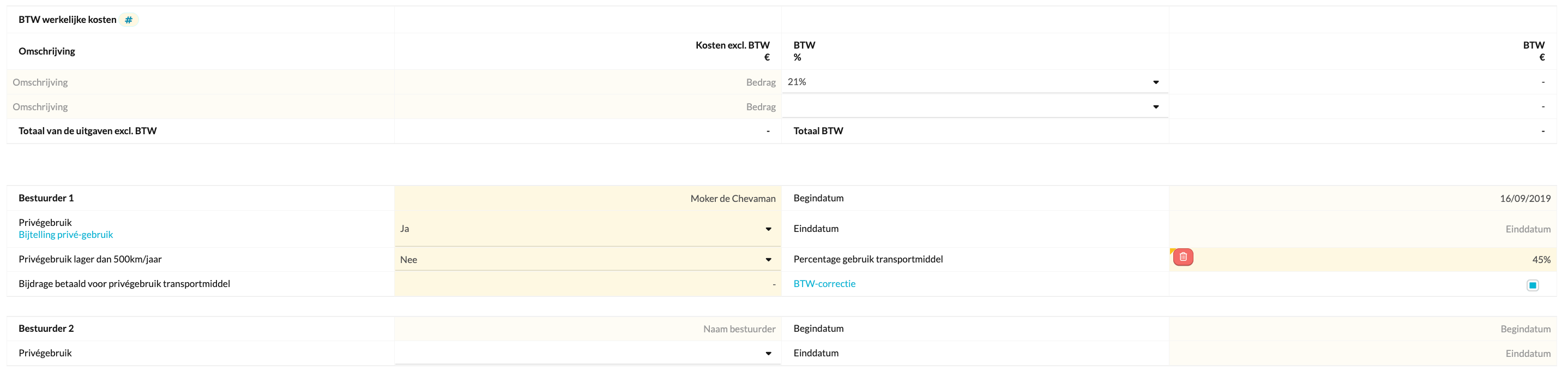 Een correcte invulling zorgt ervoor dat de bijtelling en Btw-correctie automatisch en consistent worden berekend volgens de Nederlandse fiscale regels.