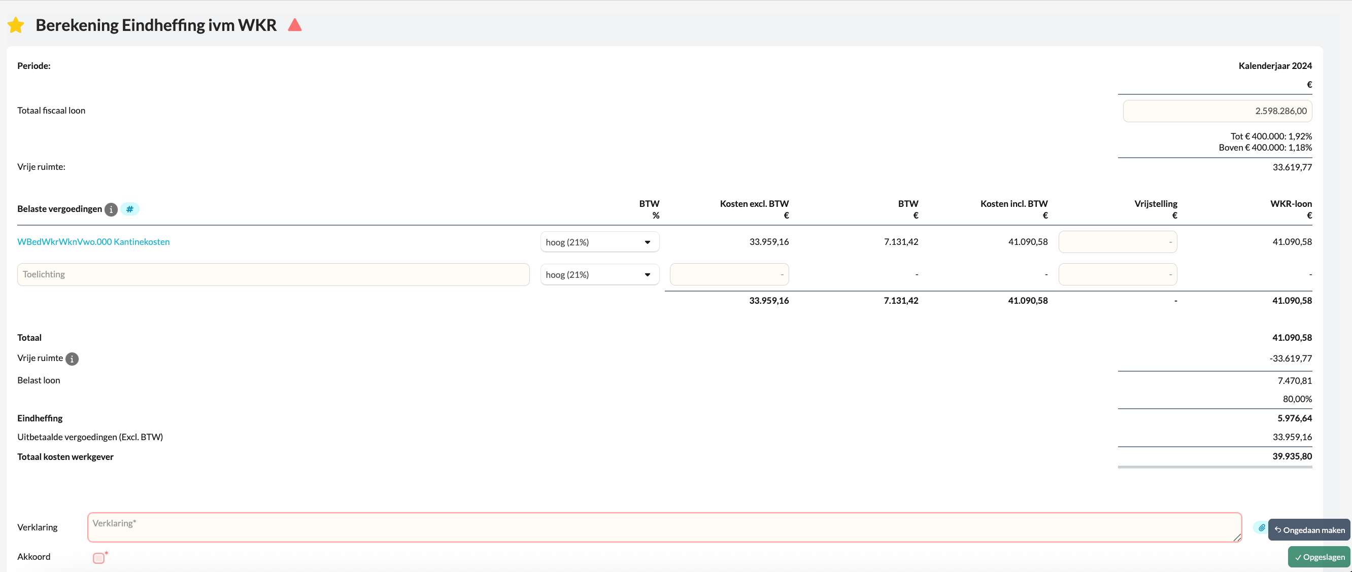Deze template berekent automatisch de eindheffing op grond van de Werkkostenregeling (WKR) op basis van het fiscaal loon en de opgegeven vergoedingen.
