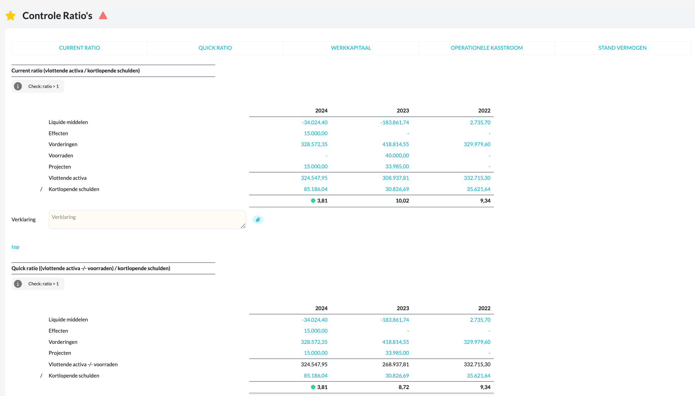 Wanneer één of meerdere ratio’s rood kleuren, betekent dit dat de waarde buiten de verwachte of veilige marge valt.