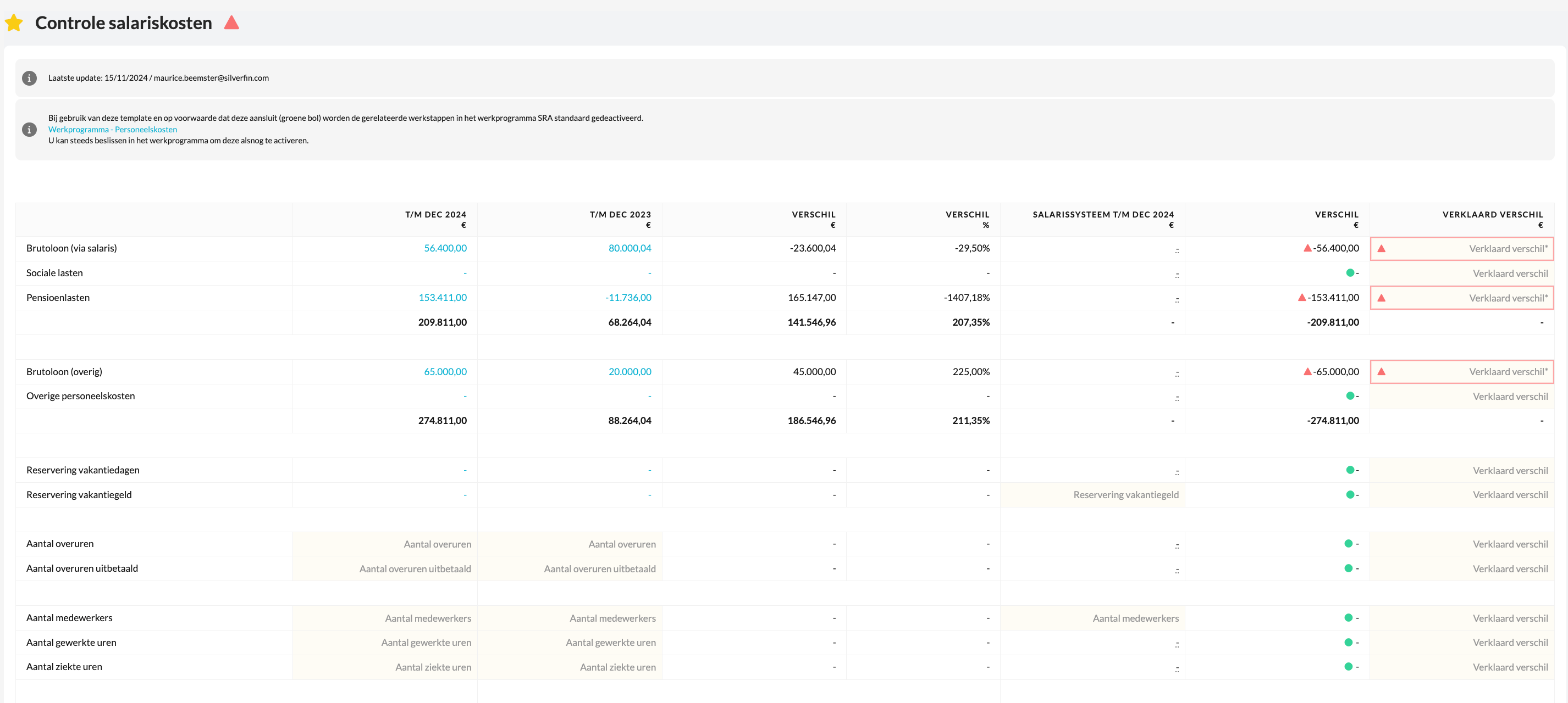 De template toont automatisch de relevante bedragen uit de loonadministratie, zodat je de salariskosten eenvoudig kunt vergelijken met de cijfers in de boekhouding.