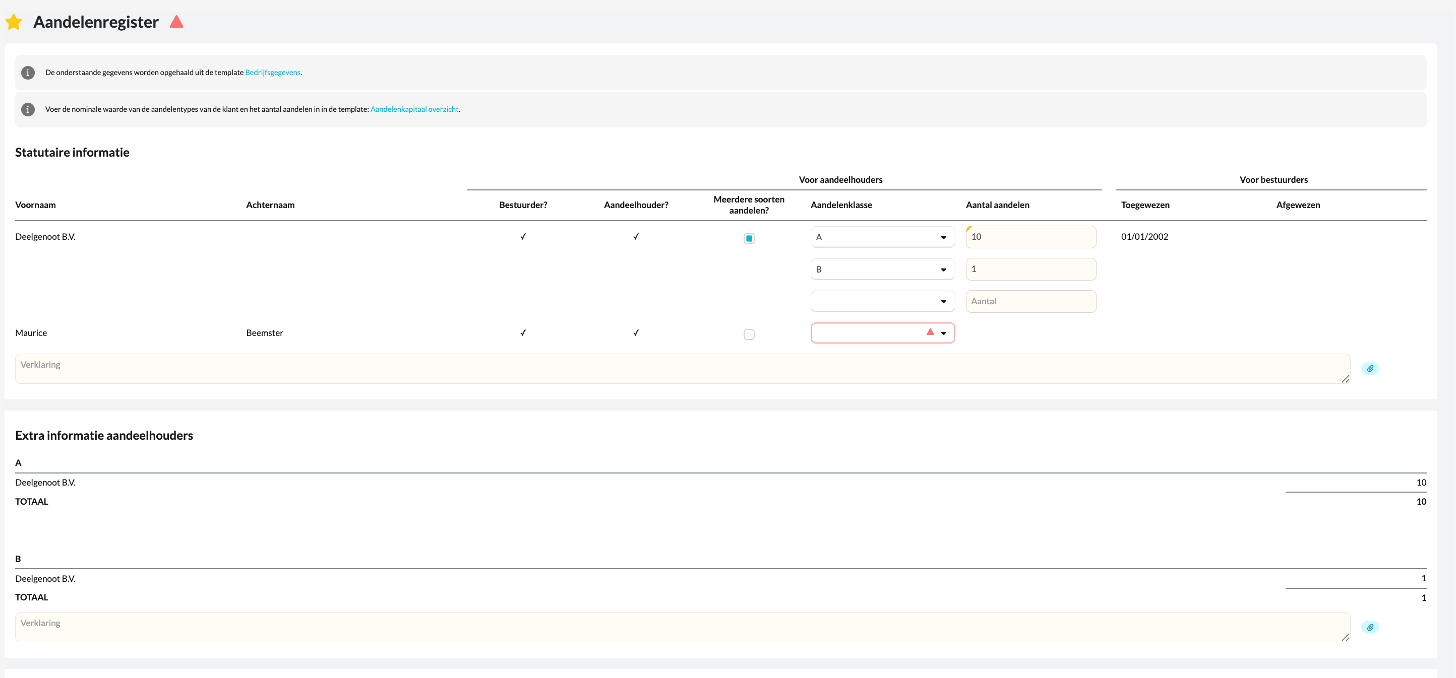 Zo kun je snel extra informatie raadplegen of eventuele correcties aanbrengen. - Controleer na aanpassingen of de wijzigingen automatisch worden bijgewerkt in het aandelenregister