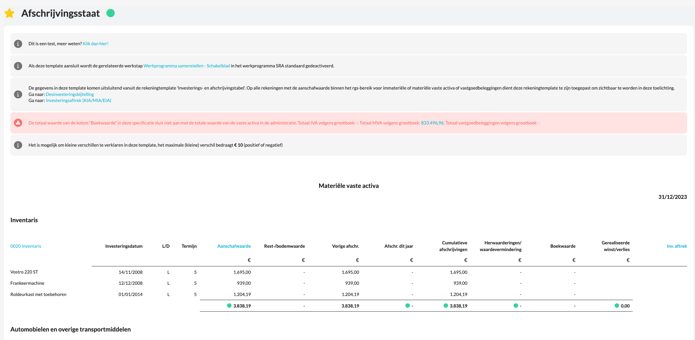 De template wordt automatisch gevuld met de informatie die is ingegeven in de account templates bij de vaste-activarekeningen.