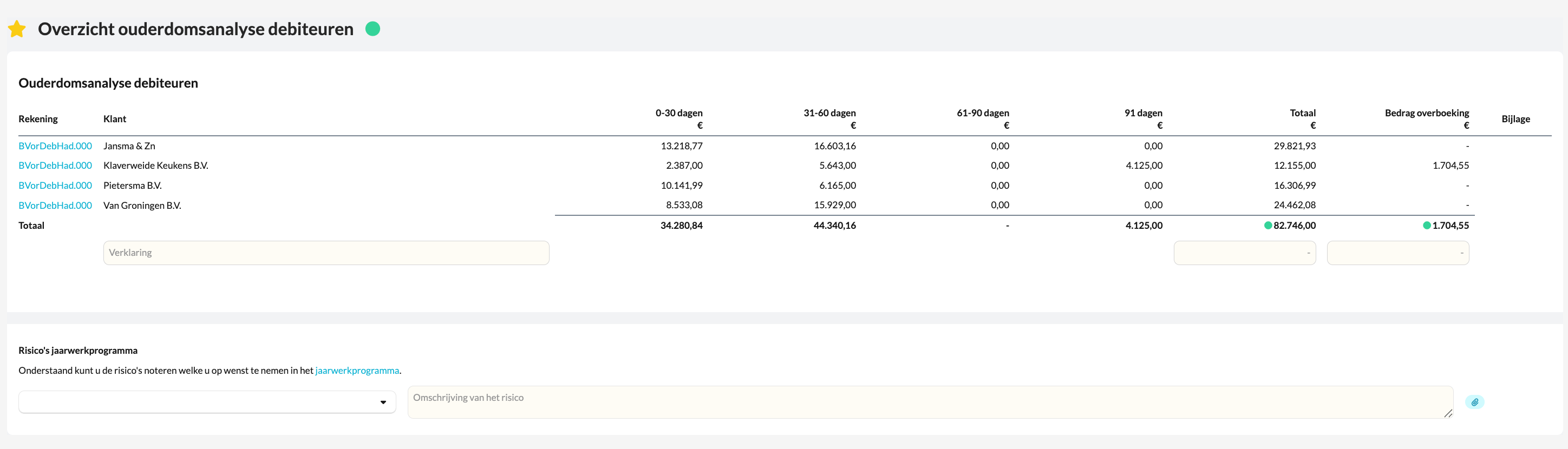 Daarnaast helpt de template bij het bepalen van de voorziening voor dubieuze debiteuren, zodat je kunt controleren of deze aansluit bij de geboekte bedragen in de administratie.