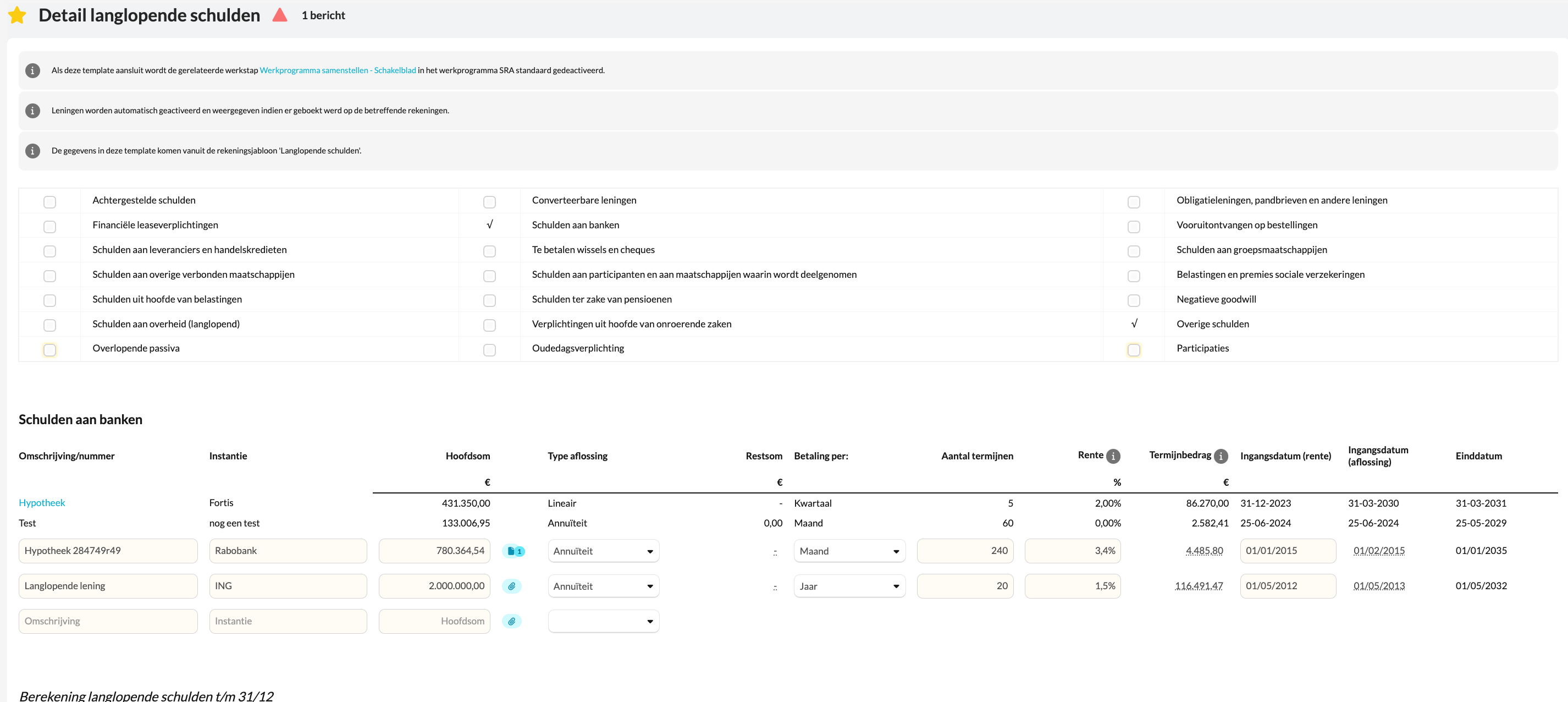 - Open de template Detail langlopende schulden in het dossier.