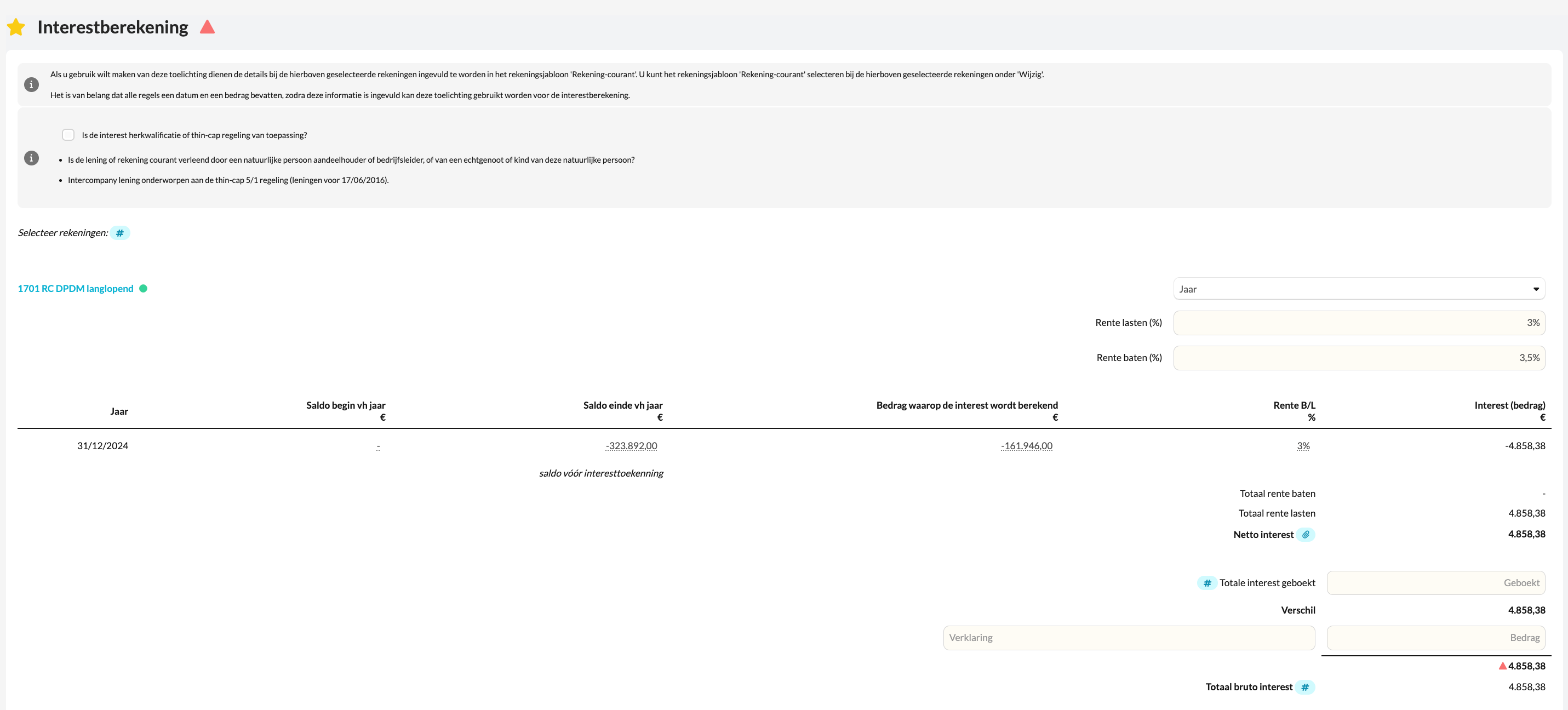 Op basis van deze gegevens berekent het systeem de rente die verschuldigd of te vorderen is, afhankelijk van het saldo en de ingegeven rentepercentages.