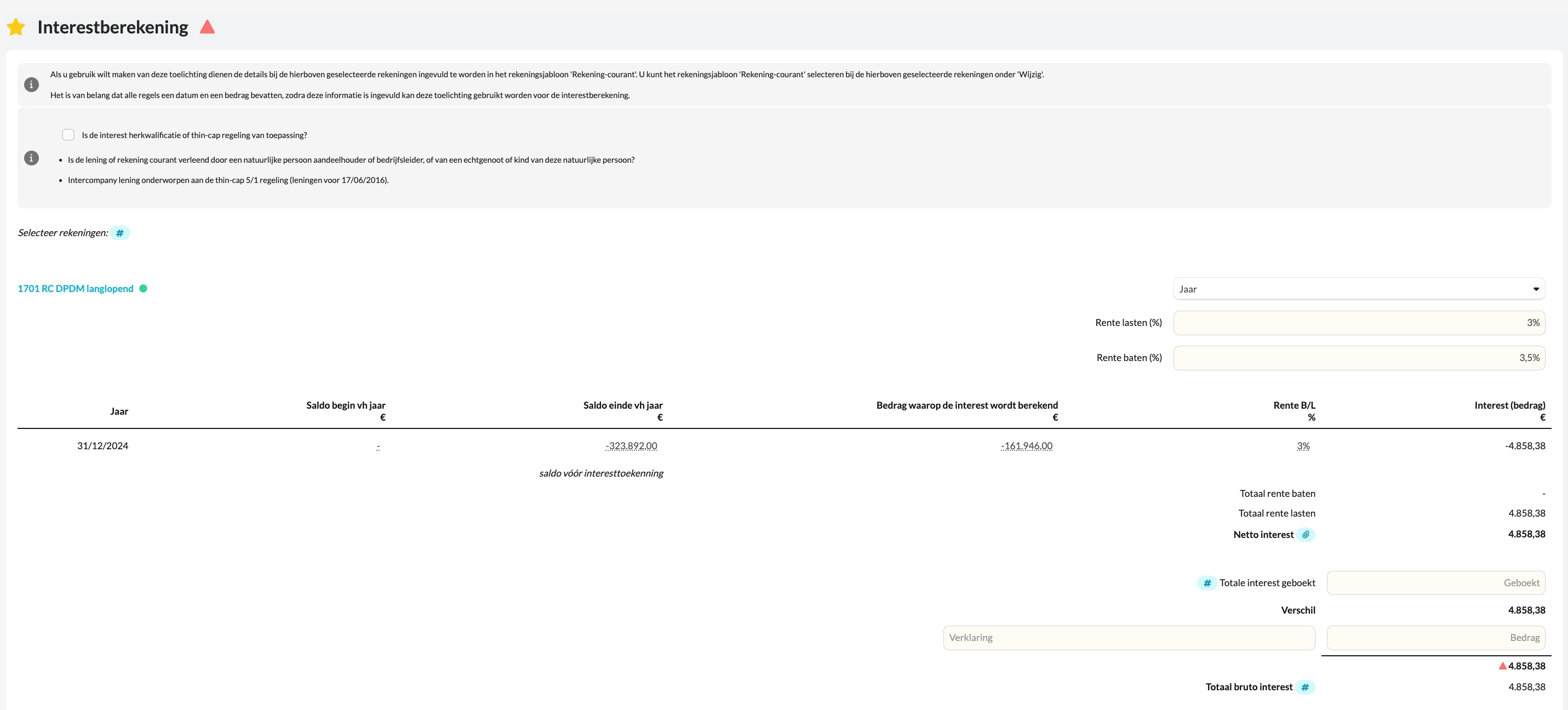- Op basis van deze gegevens berekent het systeem de rente die verschuldigd of te vorderen is, afhankelijk van het saldo en de ingegeven rentepercentages.