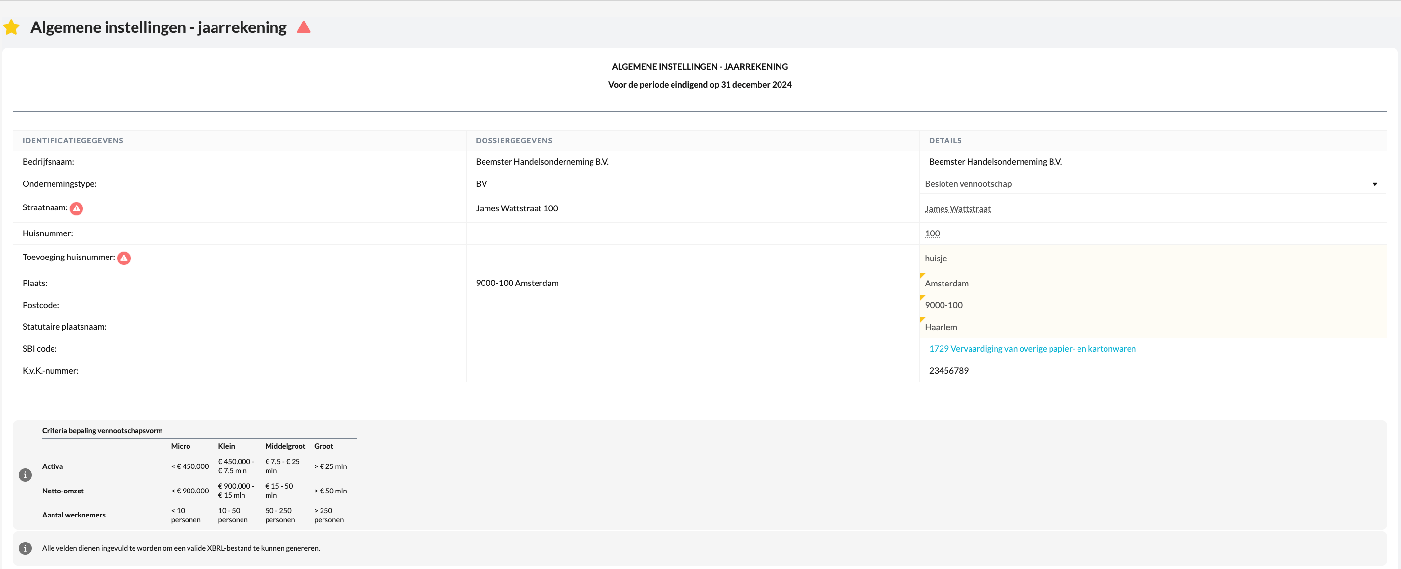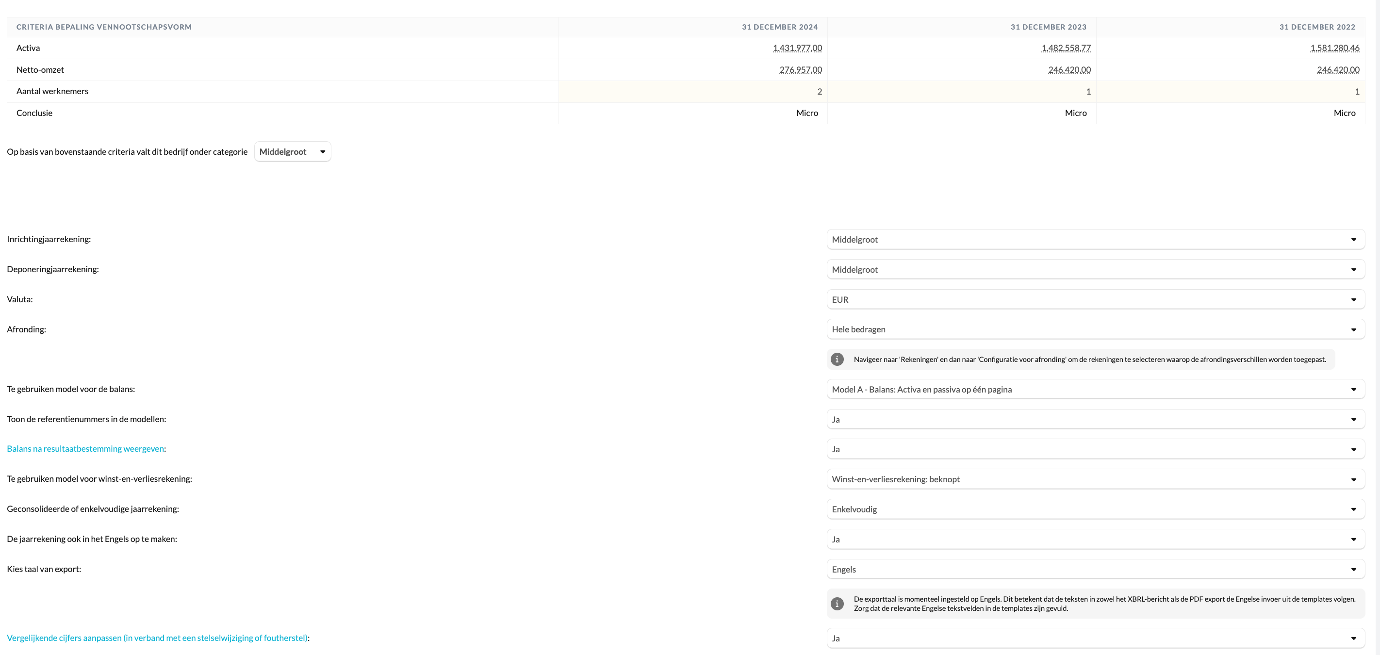 - Controleer of alle overige parameters correct zijn ingesteld op basis van de rechtsvorm en rapporteringsvereisten.