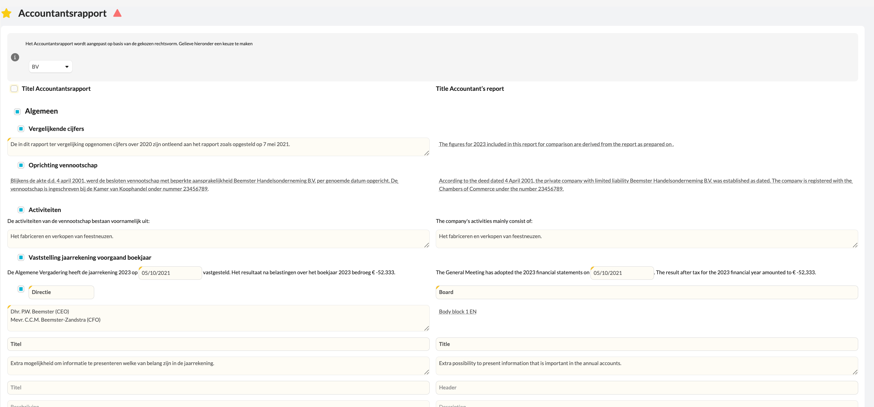 Met deze template genereer je een verkort verslag voor de accountant, inclusief balanspositie, resultaat en fiscale positie.