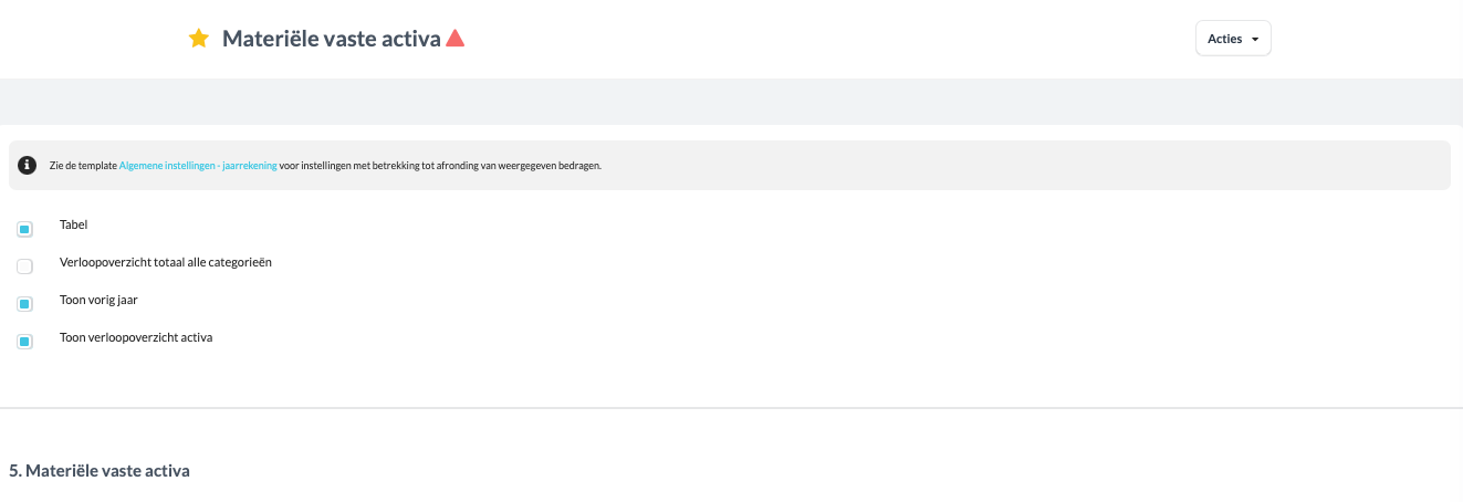 Bovenaan elke toelichting vind je een aantal instellingen waarmee je kunt bepalen welke informatie wel of niet wordt opgenomen in de jaarrekening.