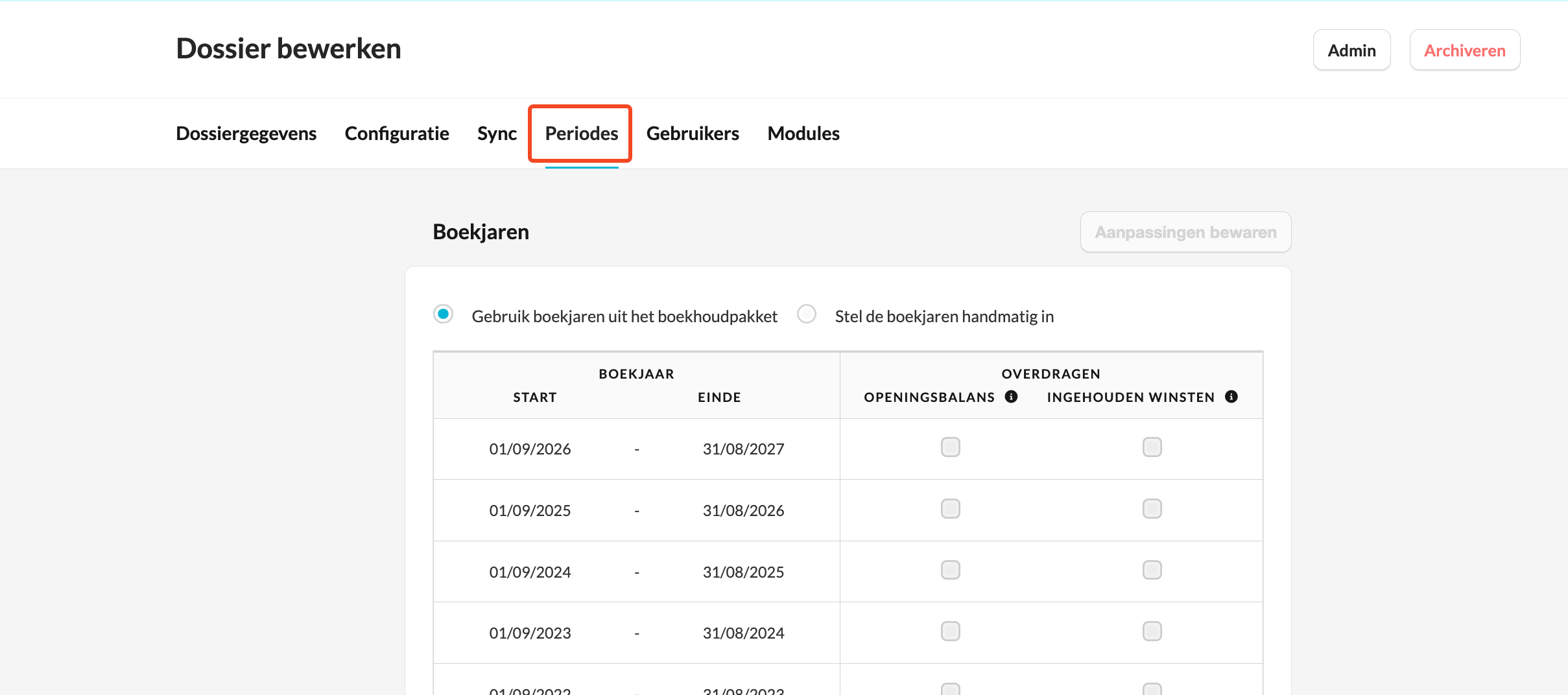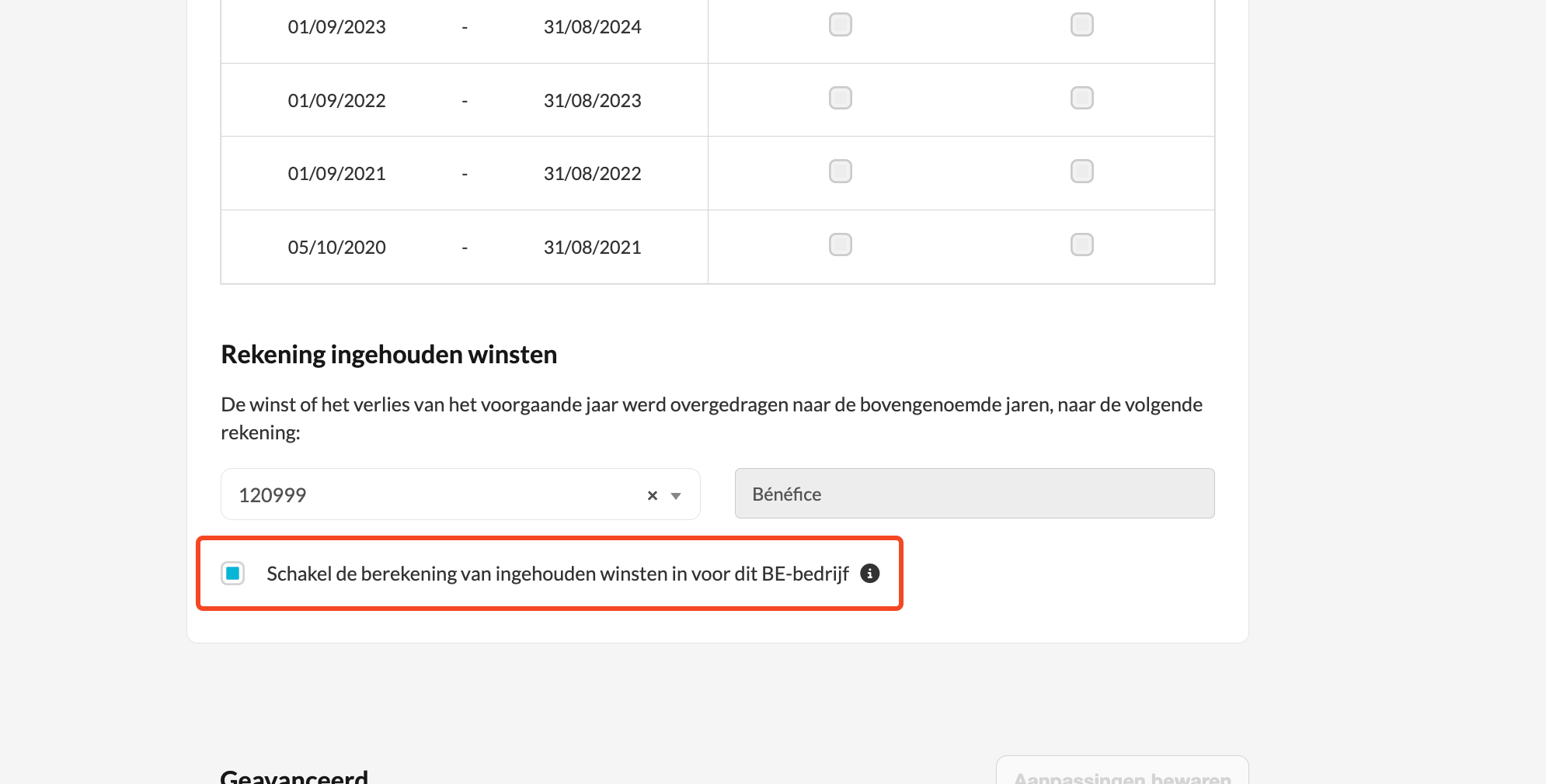 - Om deze situaties te ondersteunen, kun je ingehouden winsten handmatig inschakelen voor specifieke Belgische dossiers.