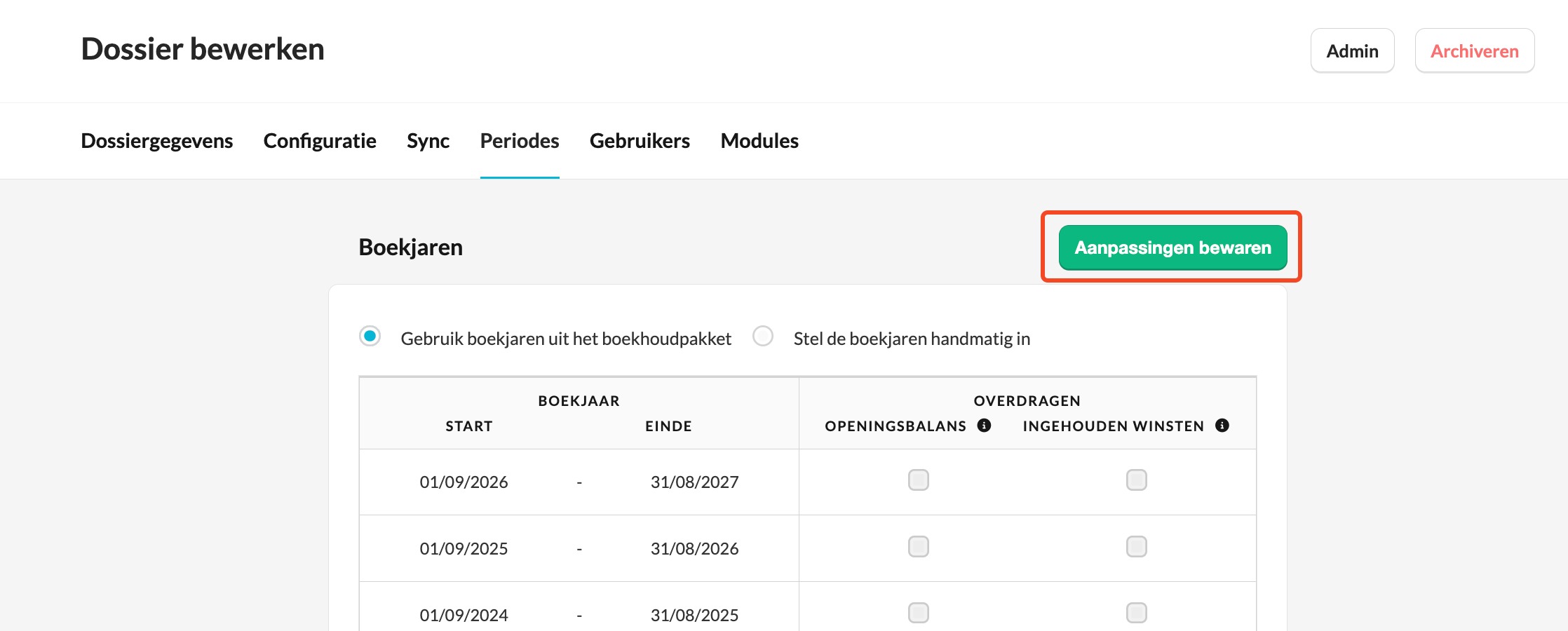 - Deze optie is alleen zichtbaar wanneer ingehouden winsten beschikbaar zijn binnen je kantoor én het dossier een Belgisch adres heeft.