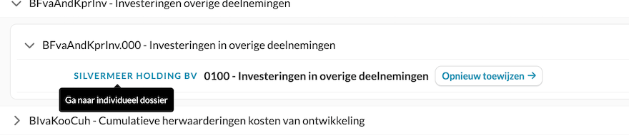 - Ter context zie je altijd het originele rekeningnummer en de naam uit het individuele dossier. Als je met de muis over de rekeningnaam beweegt, zie je aan welk suffix de rekening in het individuele dossier is gekoppeld.