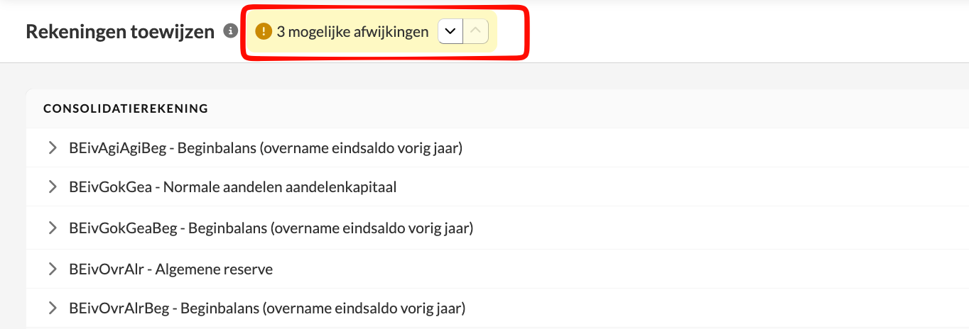 - Er is sprake van een mogelijke afwijking wanneer de rekeningnaam in een individueel dossier afwijkt van de naam in de consolidatierekening.