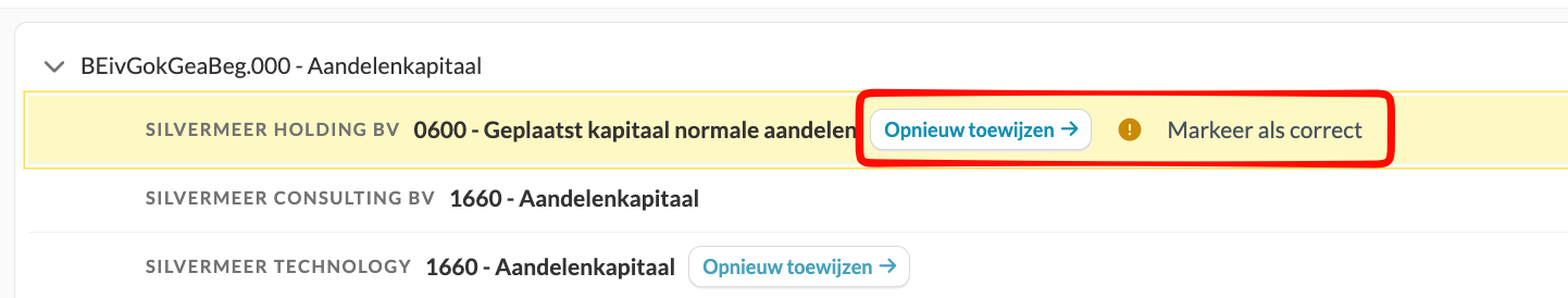 - Markeer de toewijzing als correct, indien de consolidatie-instelling juist is.
