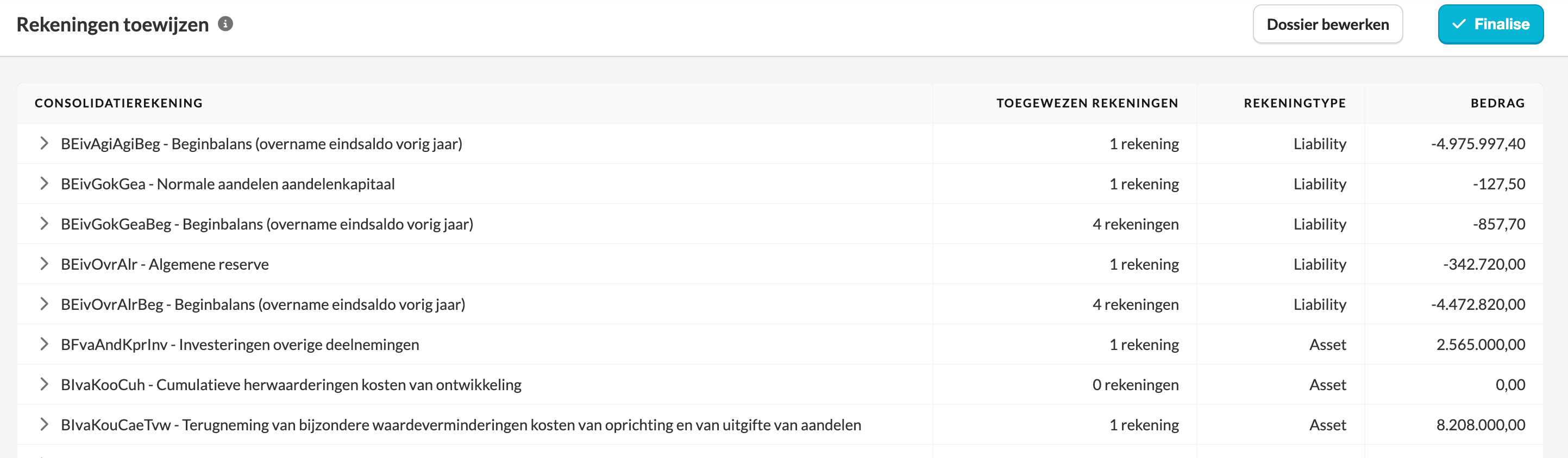 Na het controleren en bijwerken van de toewijzingen geeft je consolidatiedossier de juiste structuur weer. Je kunt altijd naar dit scherm terugkeren als je gegevens wijzigen of als er nieuwe afwijkingen worden gedetecteerd.