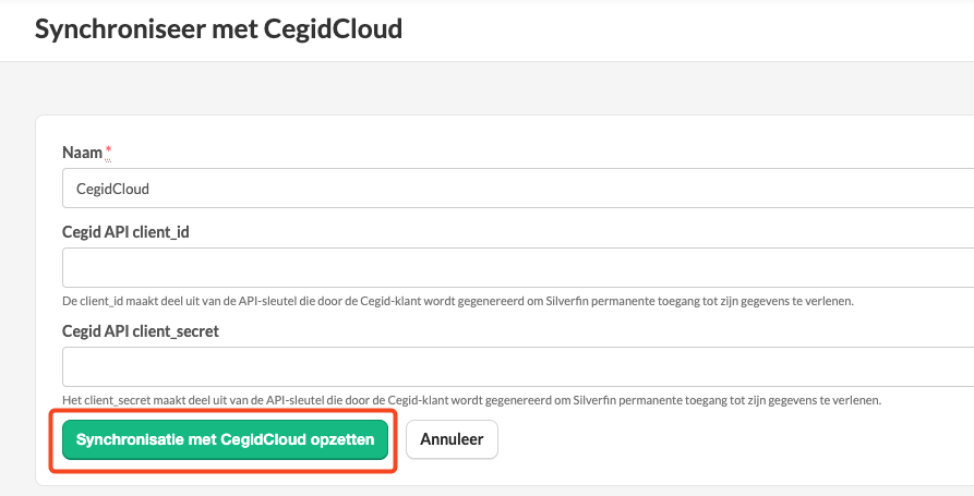- Vul de relevante velden in en klik op 'Synchronisatie met CegidCloud opzetten'.