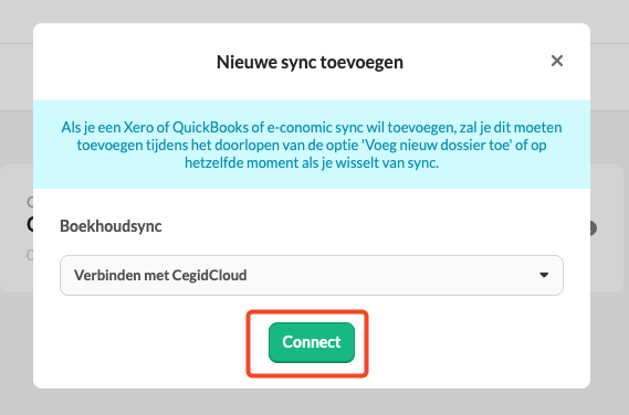 - Selecteer in het dropdown-menu 'CegidCloud' en klik op 'Connect'.