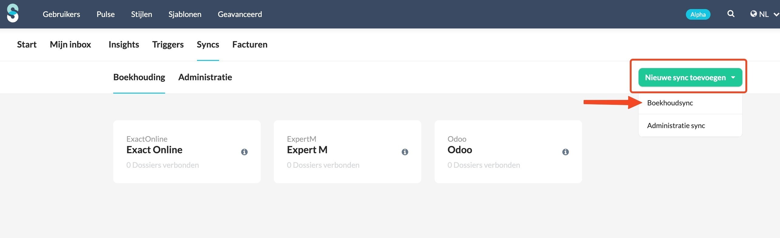 - Klik op de knop 'Nieuwe sync toevoegen' en kies 'Boekhoudsync'.