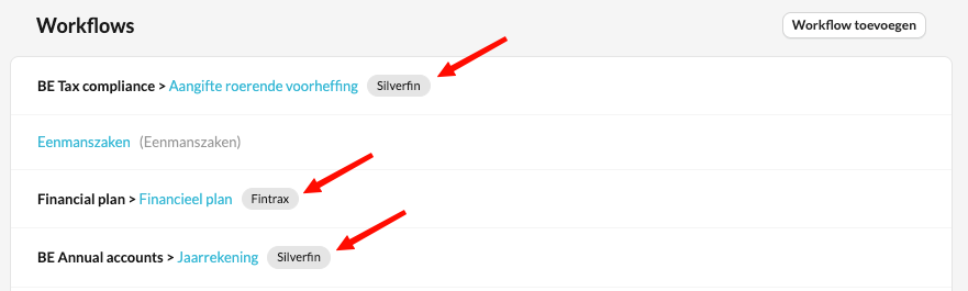 Marketplace-workflows worden ontwikkeld door Silverfin of Silverfin Partners en kunnen worden geïdentificeerd aan de hand van een grijs label naast de naam van de workflow: