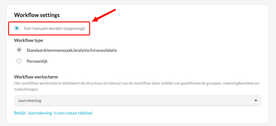 Je kan instellen of een workflow handmatig aan een dossier kan worden toegevoegd.
