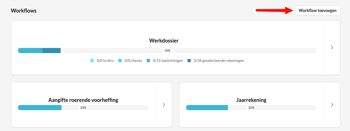 - Als deze functie is ingeschakeld, kunnen gebruikers deze op dossierniveau toevoegen via ‘Workflow toevoegen’.